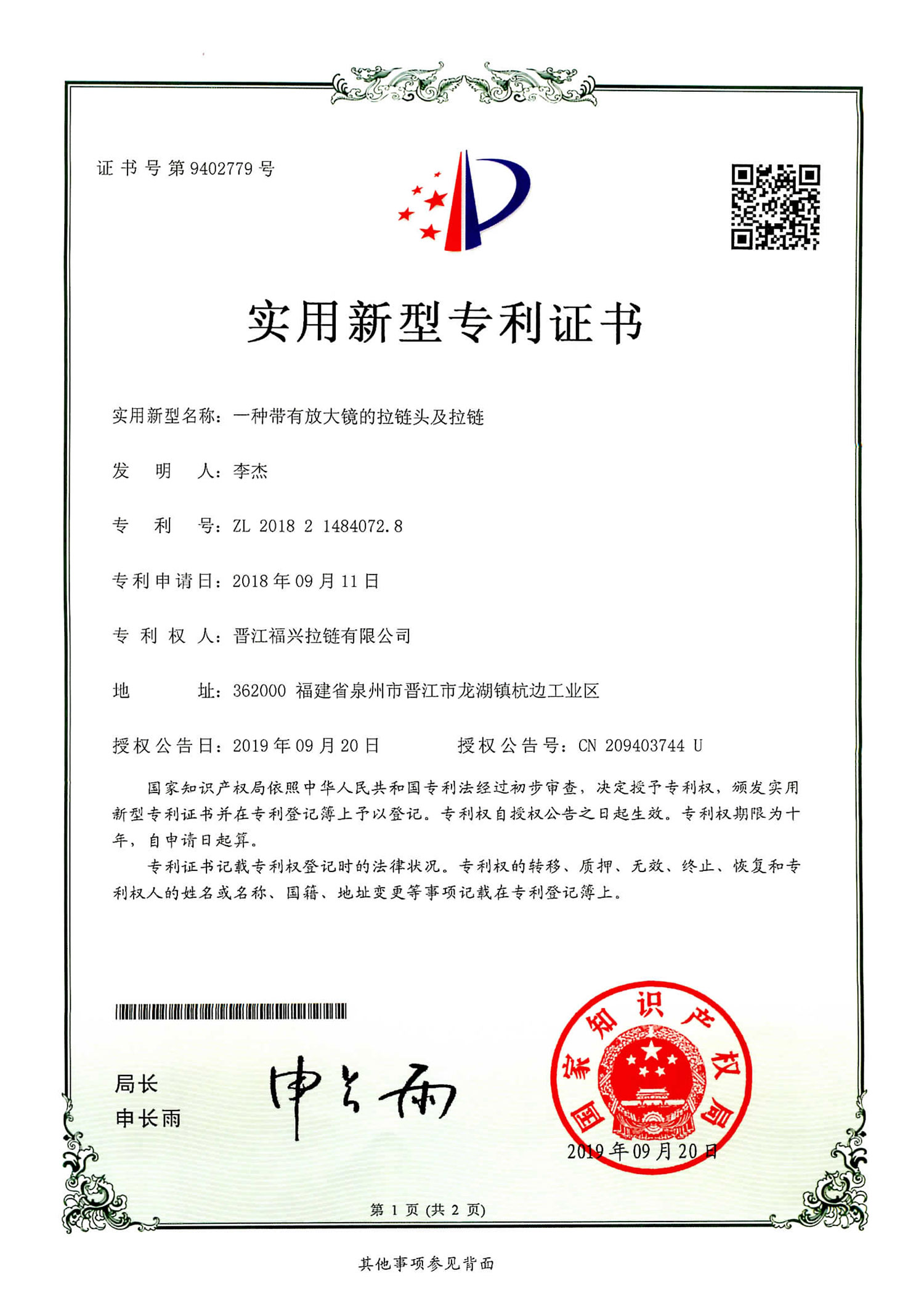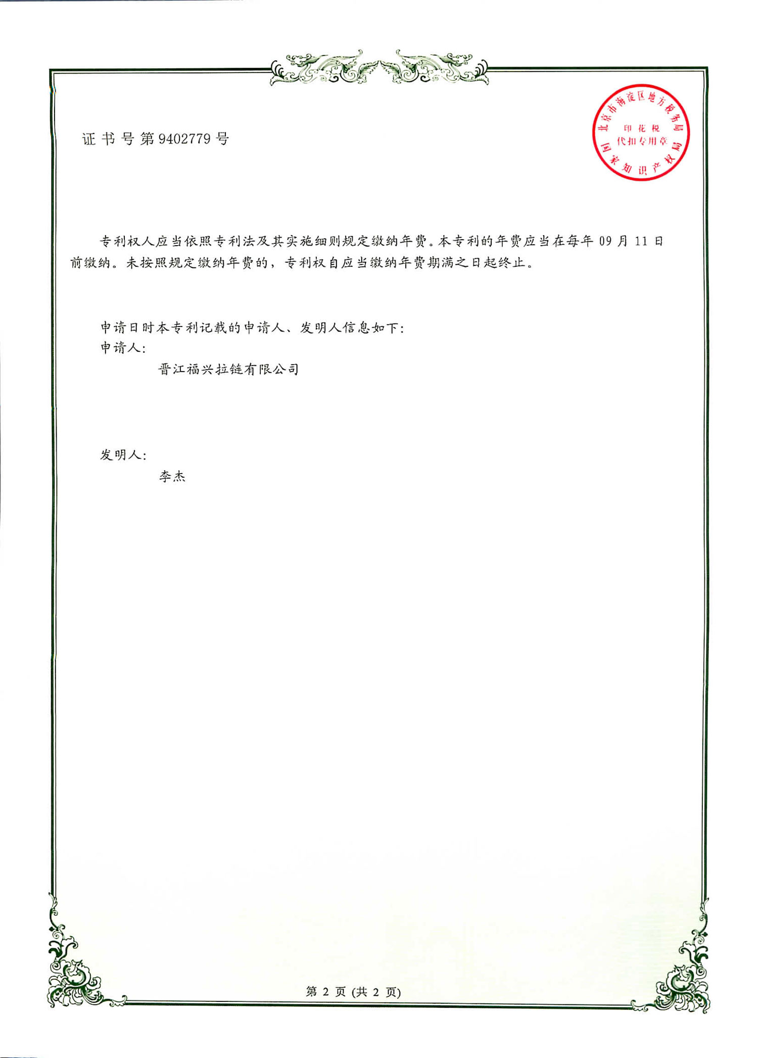 实用新型发明专利(第9402779号)